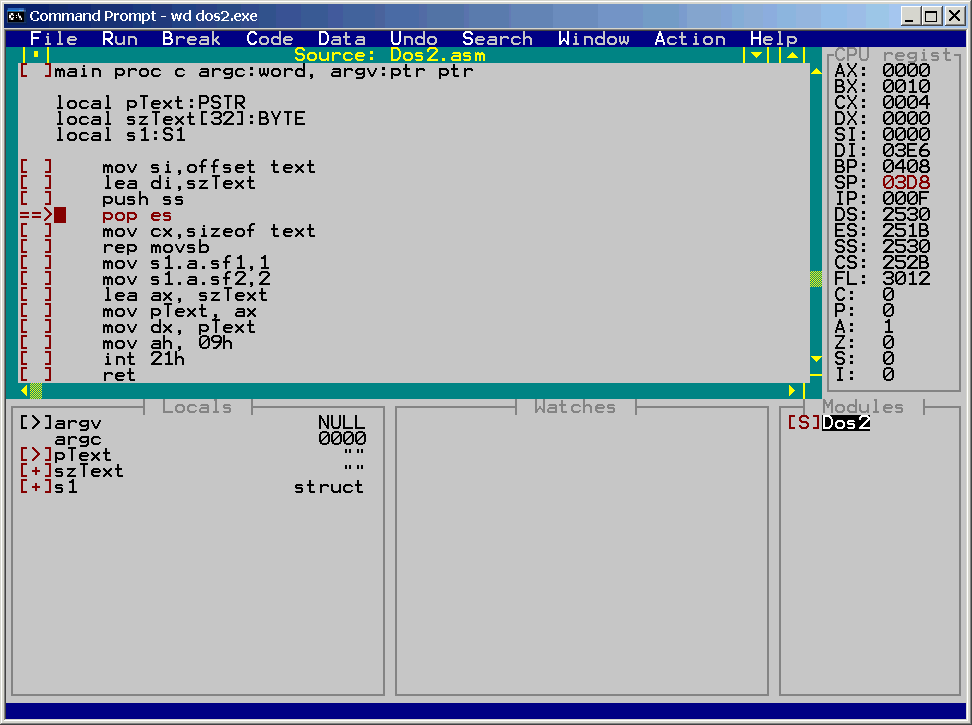 To prepare symbolic debugging with Open Watcom's WD, the assembly source must be assembled with JWasm's -Zi option. Additionally, Open Watcom's linker Wlink or JWlink has to be invoked with switches debug c and option cvp.
